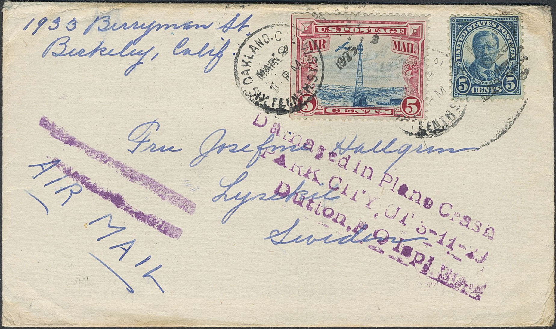 Cover from Berkeley, California, United States postmarked OAKLAND C 9 MAR 29 and addressed to Lysekil, Sweden with handstamp type A. |