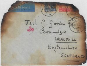 The plane was carrying mail sent from Denmark, Finland, Norway, Sweden and Estonia. The reports from the crash site said that the mail was entirely destroyed in the crash. But it seems as if a few items were recovered afterwards. The British mail was processed at London Postal Service, Mount Pleasant, London. So far only three covers sent from Norway are known.