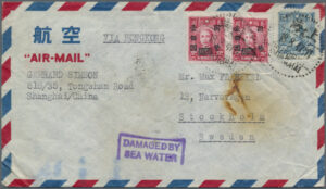 The plane carried mail from different countries in Central and East Asia (Burma, Hong Kong India, Japan, Thailand. Only a part of the mail could be salvaged. According to the Swedish label (see below) some mail was first salvaged the following year. The recovered mail was forwarded via England as well as via France.