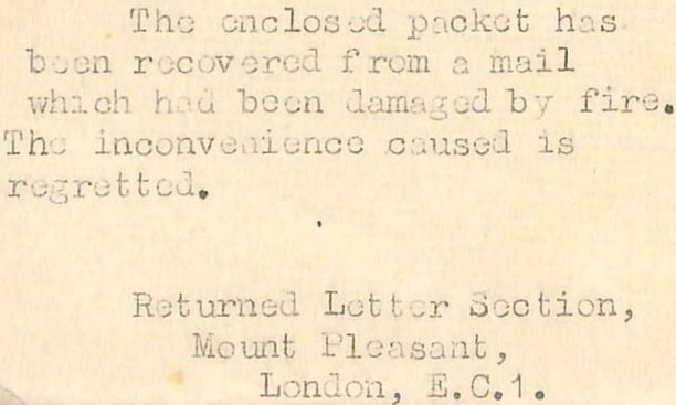 The mail was processed at the Returned Letter Section, Mount Pleasant, London where different labels were used.