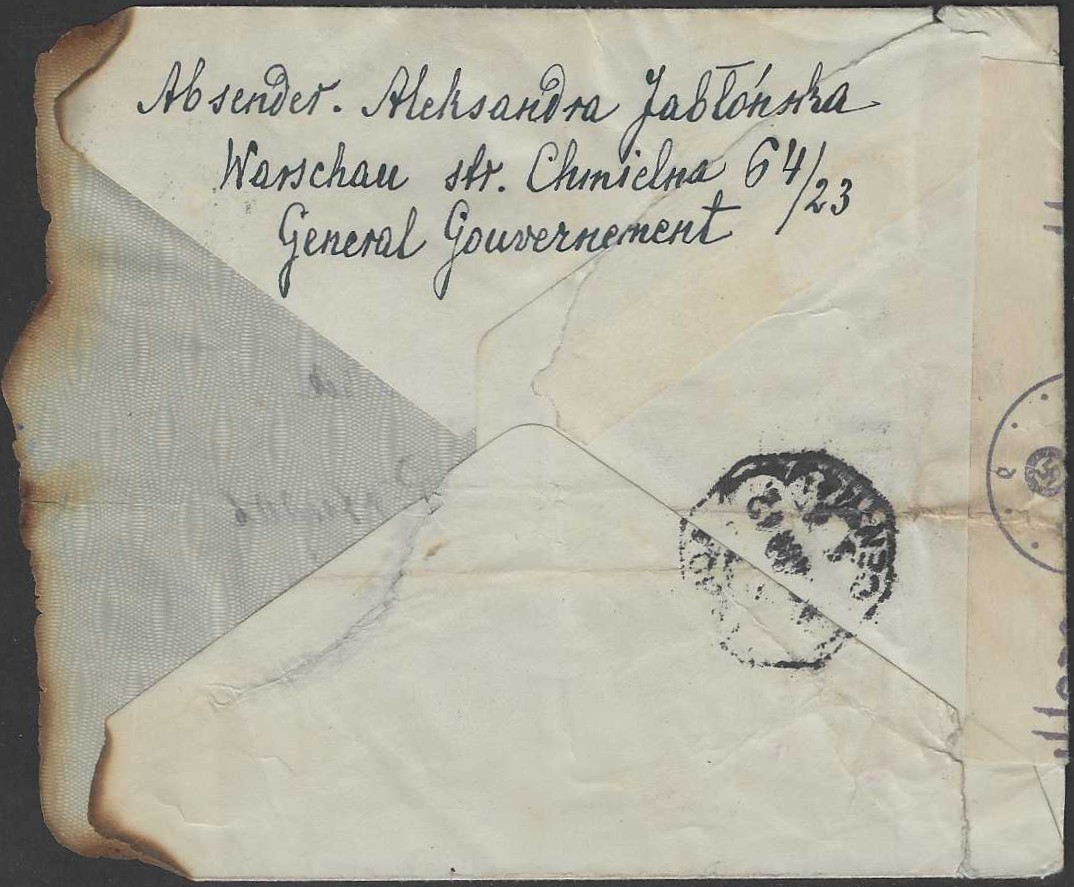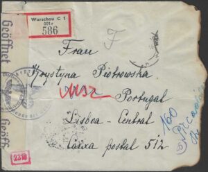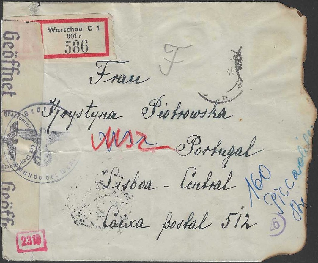 Registered cover from Warschau, Poland to a mail box in Portugal (perhaps an undercover address ) and Lisboa arrival postmark ??.ABR.42. Burned at the right side. |