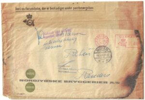 Danish SS Vidar was torpedoed and sunk by a German submarine on its way from Newcastle to Esbjerg, Denmark. Cover from Stoke-on-Trent to Copenhagen forwarded in Danish service cover. |